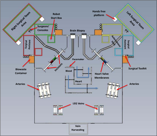 Harvested LEG veins can be grafted to the SimBody heart to increase blood flow and improve circulation throughout the body. Coronary artery bypass is used when blood flow through the heart is limited due to blocked or narrowed arteries. The robot must connect harvested veins to six (6) specific bypass locations on the SimBody heart.